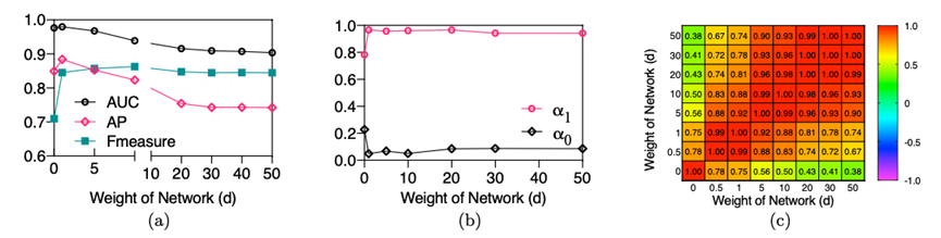图3 评论者网络的参数设定对于检测效果有重要的作用,需要合理权衡,不宜设置太大或太小