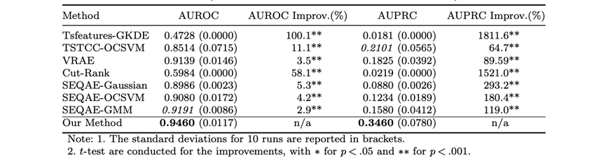图2:真实分销渠道数据集上的模型检测性能对比结果(最优结果以粗体突出显示,次优结果以斜体显示。我们的方法在AUROC和AUPRC方面优于所有基线,并且在AUPRC方面提升更为明显;同时统计检验结果表明,我们的方法显著优于基线方法。)