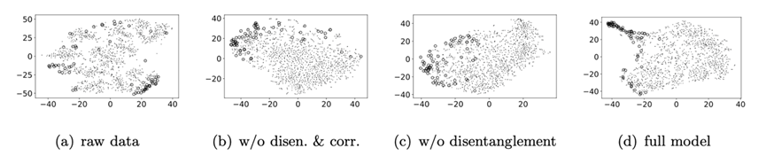 图3:分销商序列表征的t-SNE可视化结果(我们在真实分销渠道数据集上使用t-SNE将高维数据映射到二维空间进行可视化。具体地,我们分别对原始时间序列、我们模型的两个变体以及我们的模型学得的序列表征进行可视化,其中真实的异常数据用空心大圆圈突出显示,而正常数据则用小实心点标记。结果表明,我们的方法能将异常数据推离到一些低密度区域,从而清晰地区分正常和异常数据点。)