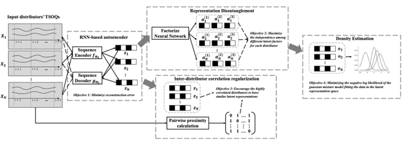 图1:模型框架示意图(模型包含基于RNN的自编码器、表征解耦模块、分销商间相关性正则约束模块、基于深度高斯混合模型的密度估计模块)