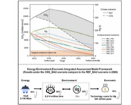 中国作为全球最大的发展中国家,面临着发展经济、改善民生、减污降碳多重挑战,迫切需要以较低的经济代价实现减污降碳协同增效。如何有效地利用协同减排措施来取得碳汞减排最佳效果,即如何以较小的成本有效地减少二氧化碳和汞排放仍是一个难题。本研究通过构建“能源-环境-经济”综合评估模型框架在省级层面探究气候、空气污染和汞减排政策的最佳实践组合,发现中国将碳中和政策与当前的空气污染控制政策相结合,是具有成本效益的协同减排路径,这将在2060年这一年减少6914百万吨(88%)的二氧化碳和71吨(88%)的汞排放,并将为中国节省了3.84亿元的汞减排技术成本。
