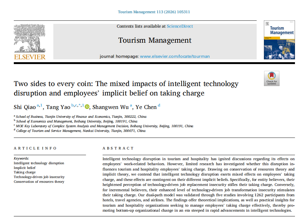 2025年9月23日,我院姚唐副教授(唯一通讯作者)领衔的跨校研究团队,在旅游管理领域国际顶级期刊Tourism Management在线发表题为“Two sides to every coin: The mixed impacts of intelligent technology disruption and employees’ implicit belief on taking charge”(“事物皆有两面性:智能技术颠覆与员工内隐信念对主动负责行为的混合影响”)的学术论文,为旅游和酒店业数智化转型中的员工管理提供了全新理论视角与实践路径。