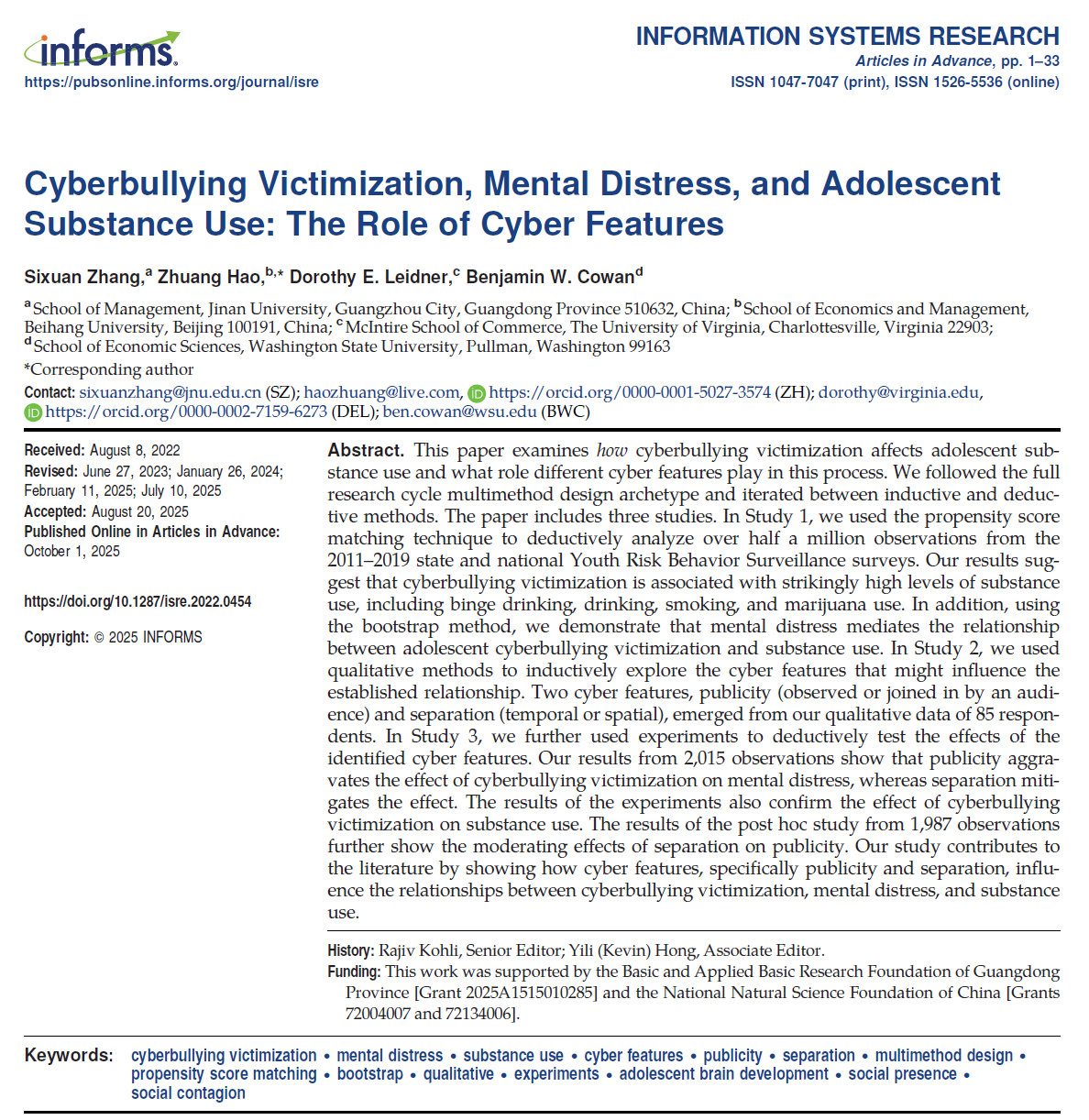 近日,我院郝壮(通讯作者)副教授与暨南大学张思萱(第一作者)、美国弗吉尼亚大学Dorothy E. Leidner及华盛顿州立大学Benjamin W. Cowan合作成果《Cyberbullying Victimization, Mental Distress, and Adolescent Substance Use: The Role of Cyber Features》发表于UTD 24国际顶级期刊《Information Systems Research》。