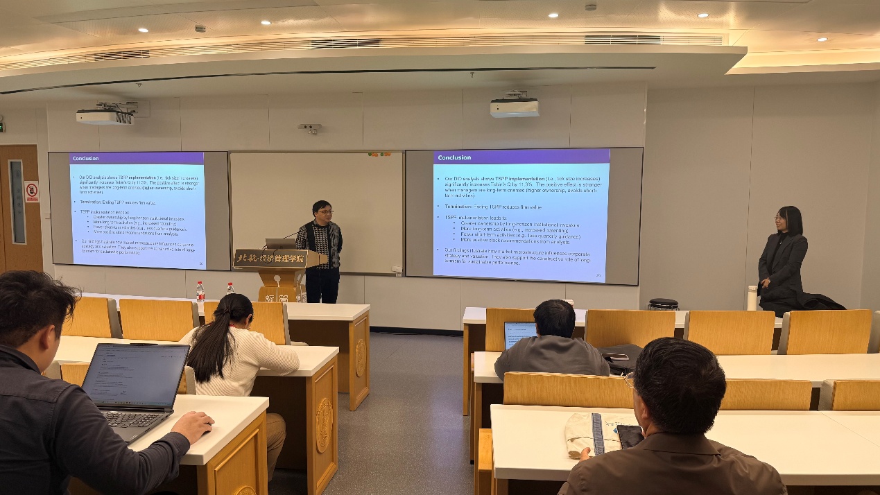 在本期讲座中,谢静副教授围绕“长期主义与企业价值”展开核心分享,为现场师生提供了长期主义正向影响企业价值的因果证据。他以美国证券交易委员会(SEC)2016年推出的“最小报价单位试点项目”为外生冲击(该项目可推动企业长期主义导向),通过实证研究发现,参与该项目的处理组企业估值显著提升。具体而言,这些企业的自愿管理层预测(尤其是短期导向的季度预测)数量减少,体现出向长期主义导向的转变;且这种价值正向效应在CEO持股率更高、短期活动(如频繁发布短期指引)更少的企业中更为突出。此外,2018年该试点项目逆转后,处理组企业的最小报价单位下降,其托宾Q值(衡量企业估值的核心指标)也随之降低。谢静副教授最终得出结论:最小报价单位的增加可促进企业长期主义,进而提升企业估值,为理解企业长期发展与价值提升的关联提供了关键实证支撑。