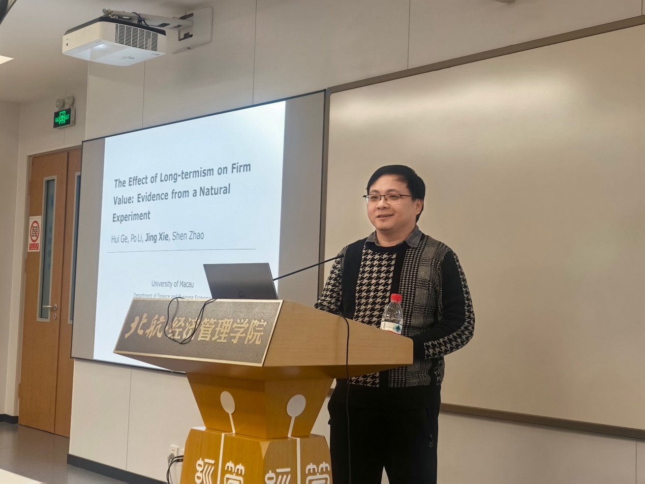 beats365亚洲体育投注金融系“融实论坛”2025年第9期(总第76期)于2025年12月12日(周五)16:00-17:30在北航学院路校区新主楼A618顺利举行。本期论坛邀请到澳门大学金融学谢静副教授,做题为“The Effect of Long-termism on Firm Value: Evidence from a Natural Experiment”的学术报告。