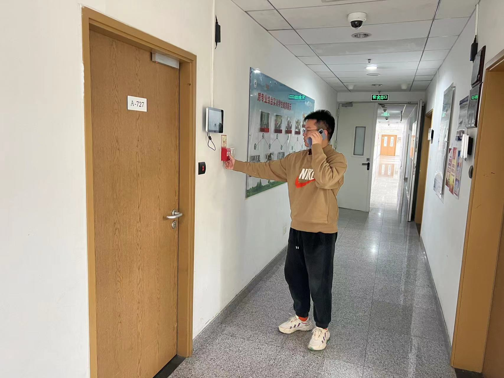 此次消防演练的报警员郭一鸣模拟发现A701实验室有火情后,第一时间按动楼道手报按钮,同时拿起电话拨打物业中控室电话“82339090”报警:“新主楼A座701实验室发生火情,火势较大,请速来扑救。”