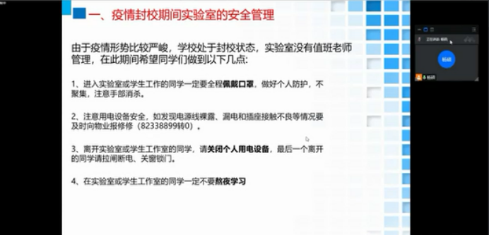 beats365亚洲体育投注实验中心于2022年6月2日上午组织实验中心有注册机位的同学参加线上消防安全培训(1学时课程),本次培训课由杨硕老师主讲。主要培训内容为实验室火灾案例分析、疫情封校期间实验室安全管理注意事项、危险源的辨识方法、相关消防设施介绍、灭火器使用方法、如何正确拨打电话报告火警、实验室安全准入管理要求等。讲解中,杨硕老师特别强调了封校期间实验室的安全管理、灭火器的使用方法和实验室安全准入管理等重点事项。