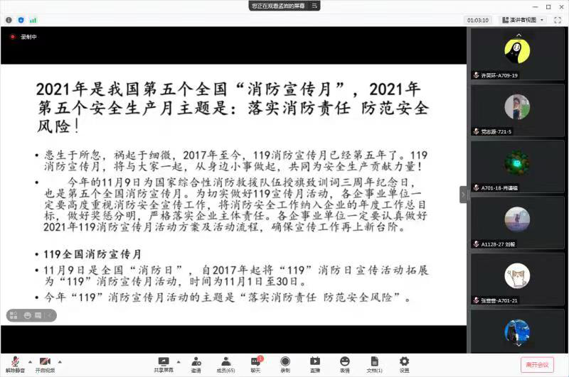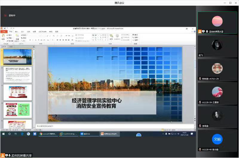 为贯彻落实学校《关于开展消防安全专项检查的通知》相关要求,强化消防安全宣传教育培训,经济管理实验中心结合“消防宣传月”广泛开展消防安全宣传,于11月6日下午以线上形式组织各实验室的学生开展了一次消防安全警示教育培训,培训会由杨硕老师主讲。