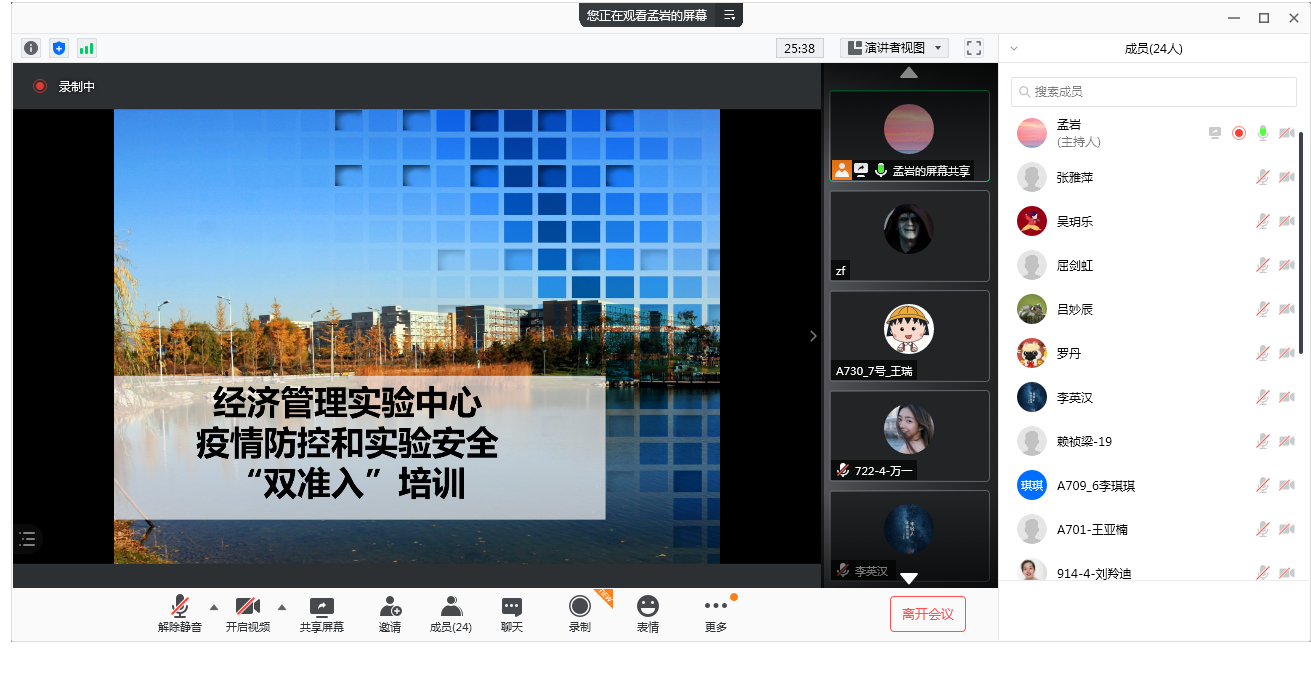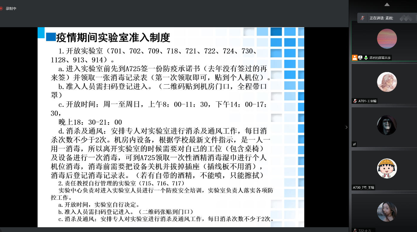 按照学校秋季学期实验室疫情防控工作的通知要求,我院实验中心于2021年9月2日下午14点通过腾讯会议组织实验中心有注册机位的同学进行“疫情防控和实验安全”双准入培训。本次培训由实验中心杨硕老师主讲。