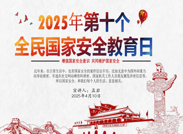 依据学校下发的《关于开展2025年“4·15”全民国家安全教育日系列活动》通知,2025 年是国家安全法颁布施行10 周年,4月15 日将迎来第十个全民国家安全教育日。根据中央和上级的工作部署,结合学校实际,即日起开展“4·15”全民国家安全教育日系列活动。经济管理实验中心根据学校通知要求,于2025年4月10日下午14点,通过在线腾讯会议形式,组织实验中心范围内各实验室的学生线上参与了国家安全教育日培训。本次培训由实验中心孟岩老师主讲。
