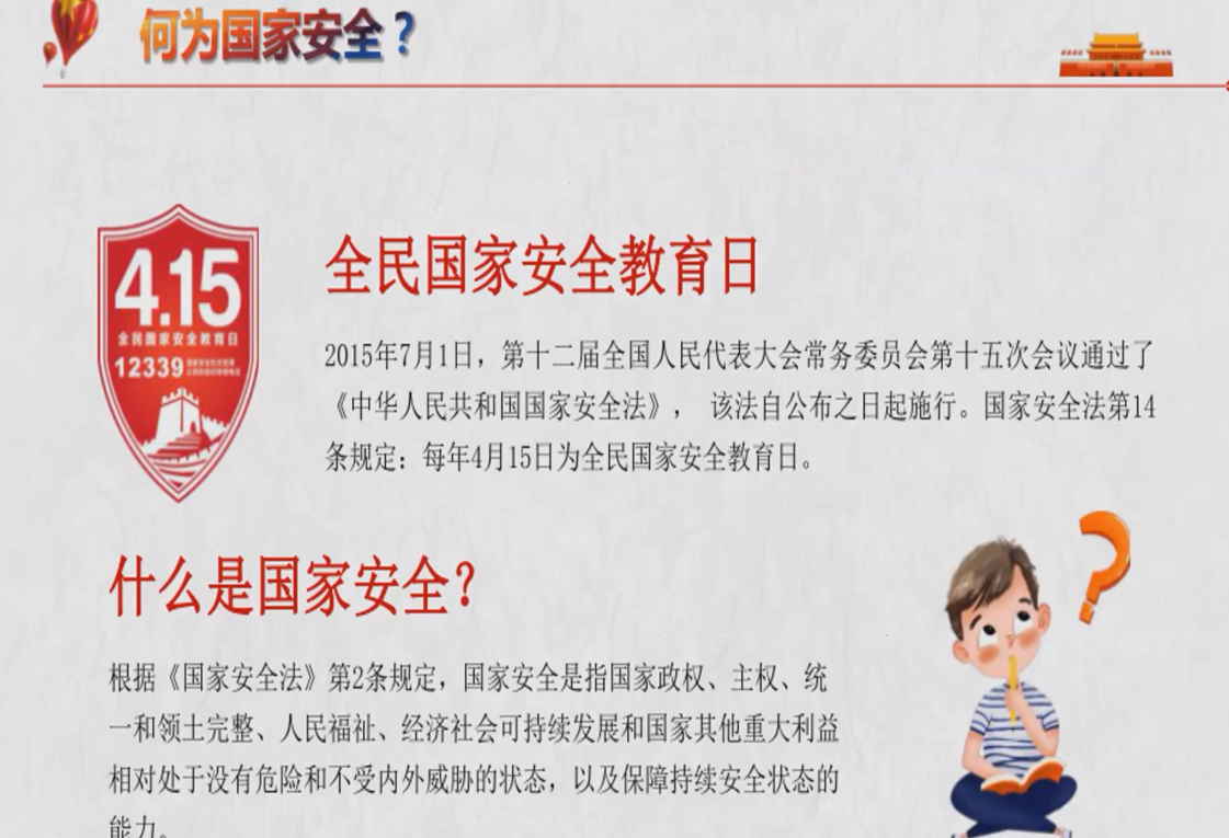 本次培训主要是宣传普及国家安全相关法律法规和安全知识等,PPT内容共分6个部分展开讲解,包括何为国家安全、当前国际国内形势、危害国家安全的行为及相关罪名、如何维护国家安全、谁来保卫国家安全、国家安全知识知多少等。并组织学生观看国家安全主题警示教育宣传片等内容。