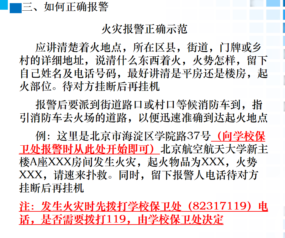 此次培训内容结合近期火灾事故教训、讲解事故案例;从火灾的基本常识、相关火灾案例宣讲、实验室内常见的消防隐患、相关消防设施介绍、灭火器使用方法、逃生的相关知识及新主楼逃生路线、如何正确拨打电话报告火警等多个方面进行了细致的讲解,并通过案例讲解和视频演示让大家熟知消防安全各项技能。此次培训目的旨在增强师生的安全意识,提高逃生避险、自救互救技能。
