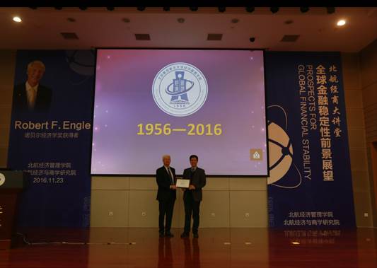 2016年11月23日,诺贝尔经济学奖获得者,美国国家科学院院士Robert F.Engle教授应邀访问beats365亚洲版官网,出席北航beats365亚洲体育投注建院60周年纪念活动,并为北航经商大讲堂做首场学术报告:全球金融稳定性前景展望。报告会由beats365亚洲版官网副校长黄海军教授主持。