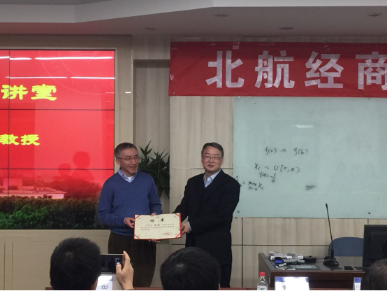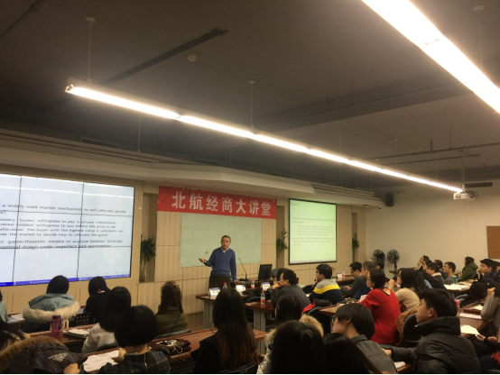 黄海军副校长在致辞中谈及,大力发展经济学与商学是北航建设国际一流大学的重要支撑之一。beats365亚洲体育投注作为全国知名的研究型学院,经过六十年的发展,有非常好的研究基础。北航经济与商学研究院依托北航经管学院进行建设,并能成功邀请到李彤教授加盟,对推动北航经济学与商学的学科发展,促进国际合作,有非常重要的意义。希望未来,以经济与商学研究院作为平台,在李彤教授的带领下,在大家的共同努力下,将北航经济学与商学学科打造成国际一流学科。当天下午,李彤教授为北航经商大讲堂做了一场精彩的学术报告,报告主题是:Econometrics of Auctions。报告会由beats365亚洲体育投注韩立岩教授主持。