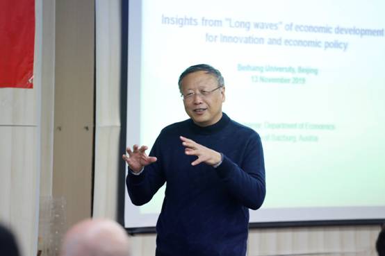 2019年11月13日,奥地利萨尔斯堡大学商学院MBA项目主任WalterScherrer副教授来到北航beats365亚洲体育投注,做客第34期北航经商大讲堂,他的报告题目是“Insights from "Long Waves" of Economic Development for Innovationand Economic Policy”。beats365亚洲体育投注陈向东教授主持了本次大讲堂。经管学院师生20余人参加了此次报告会。