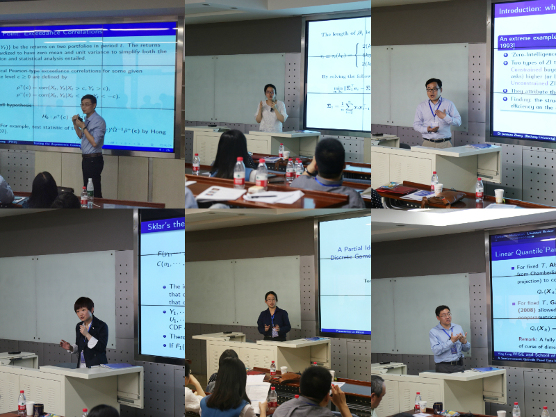 在计量经济学会场中,厦门大学WISE研究院的方颖教授作了题为“Semiparametric Quantile Panel Data Modelwith An Application to Estimating the Growth Effect of FDI”的报告。首先做了面板数据的分位数回归半参数模型,并把模型应用到估计FDI的增长效率中。上海财经大学的易艳萍副教授汇报了她和耶鲁大学陈晓红教授目前在做的一个工作,题为“Estimation of Multivariate SemiparametricGARCH Filtered Copula Models”,这个工作探讨了动态半参Copula多元时间序列(SCOMDY)模型的估计以及统计推断问题。北京大学光华管理学院的宋晓军博士作了题为“Testing the asymmetric comovements in financialmarkets - a stochastic process approach”的报告,汇报了基于随机过程的工具构建的两个检验统计量,并用于检验股票市场里的同步上涨和同步下跌对称性的问题。然后,上海交通大学安泰经济与管理学院的赵锂博士作了题为“A Partial Identification SubnetworkApproach to Discrete Games in Large Networks: An Application to QuantifyingPeer Effects”的报告,汇报了她在社交网络方面的一些研究,并提出了一些测量社交网络同伴效应的方法。此外,我们学院的马莹莹博士作了题为“Banded Spatio-Temporal Autoregressions”的报告,分析了关于如何利用经济数据中常见的时空信息,构造一系列的高维时空自回归模型,该模型相对传统模型具有更好的预测效果与可解读性。最后,来自我们学院的张军欢副教授作了题为“Modeling Influence of Social Networks inDouble Auction Market Returns”的报告,通过社交网络人工股票市场模型探讨了社交网络对双向拍卖市场收益率的影响。