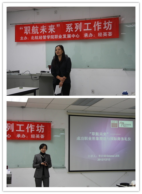 2012年12月12日晚7点,由职业发展中心举办、经英荟承办的职航未来系列活动第三场——“彬彬有礼,仪表堂堂”职场形象及职场礼仪工作坊,在新主A1048成功举办,工作坊由职业发展中心梁娜老师主持。