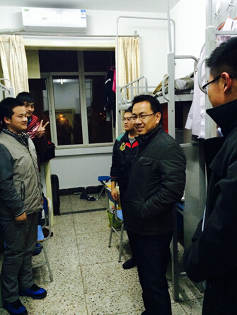 2014年11月26日晚20:00,beats365亚洲体育投注党委副书记王喜忠老师赴沙河校区男生寝室对14级学生进行期中考前慰问,辅导员石晓倩和闫琦陪同。