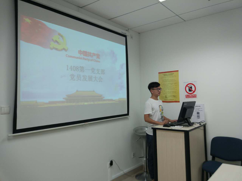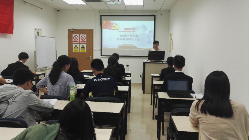 2017年6月7日晚8点,1408第一党支部在A1036召开了预备党员转正会议,会议主要讨论杨仲侠、温馨、石岩松和毕艺苇同志的转正事宜。会议由1408第一党支部书记俎富豪同志主持。