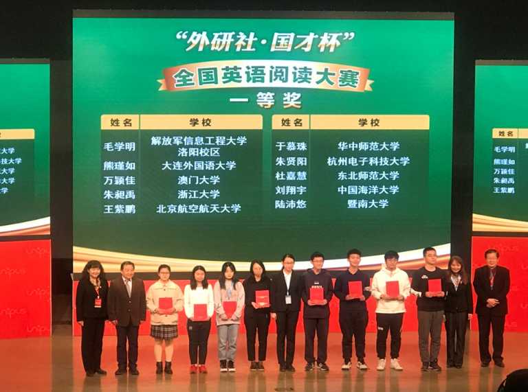 我院本科生王紫鹏获“外研社·国才杯”全国英语阅读大赛总决赛一等奖12月11日,2019“外研社·国才杯”全国英语阅读大赛总决赛在外研社国际会议中心落下帷幕,我院2018级本科生王紫鹏同学从来自31个省、市、自治区以及澳门特别行政区的180名选手中脱颖而出,荣获大赛一等奖。(右5为王紫鹏)“外研社·国才杯”全国英语写作和阅读大赛由教育部高等学校大学外语教学指导委员会、教育部高等学校英语专业教...