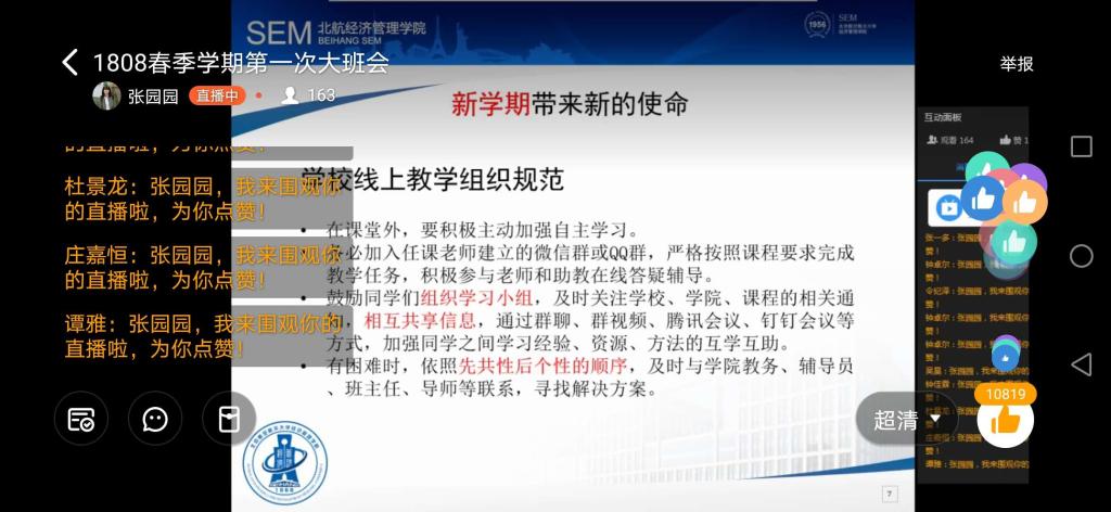 1808大班2020年春季学期收假大班会顺利举办2020年2月23日15:00,1808大班2020年春季学期收假大班会顺利举办。本次大班会采取钉钉线上直播形式开展,大班会由辅导员丁得彬和辅导员张园园主持,主题是新学期·新形势·新学风,1808大班全体同学参加了此次班会。丁得彬导员首先向大家传达了学校关于新学期的一系列安排,提醒同学们要秉承北航学子刻苦学习的优良传统,遵守学校线上教学的组织规范,严格自律,认真...