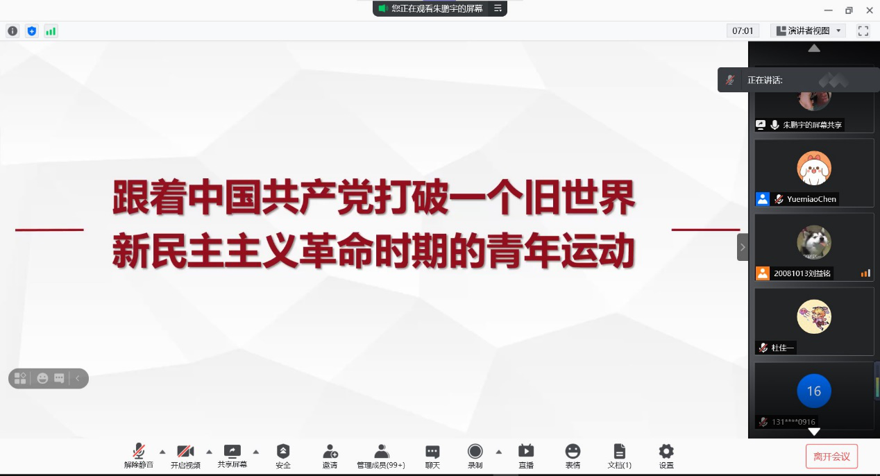 2021年5月8日晚,beats365亚洲体育投注分团委朱鹏宇书记为学院的共青团员们带来了一场既深刻又生动的主题团课——“跟着中国共产党打破一个旧世界,新民主主义革命时期的青年运动”。作为在五四青年节时期开展的以青年运动为主题的团课,朱老师带领学院共青团员走入了新民主主义革命时期的青年运动历史,讲述了那个年代青年们的伟大事迹。在简述史实的基础上,朱老师为团员们梳理了新民主主义革命与旧民主主义革命的时间线及重大历史事...