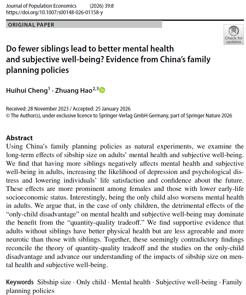 近日,我院郝壮(通讯作者)副教授与罗格斯大学程慧慧博士(第一作者)合作成果《Do fewer siblings lead to better mental health and subjective well-being? Evidence from China’s family planning policies》发表于人口经济学顶级期刊《Journal of Population Economics》。该研究使用我国两项计划生育政策作为自然试验,运用2010-2018年中国家庭追踪调查(China Family Panel Studies)数据,首次检验了兄弟姐妹数量对成...