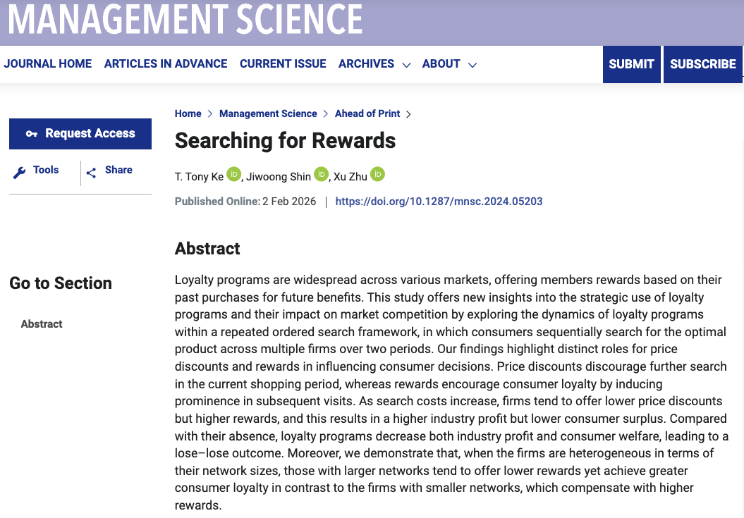 北航经管学院朱旭博士后的论文《Searching for Rewards》,近日被UTD期刊Management Science录用。本研究成果曾获2023年 ISMS 博士生早期研究基金 (ISMS Doctoral Early-Stage Research Grant)支持。朱旭为本文的通讯作者,合作者为香港中文大学柯特教授,以及美国耶鲁大学Jiwoong Shin教授。论文研究在各类市场中广泛应用的忠诚度计划(loyalty programs): 根据会员以往的购买行为提供奖励,以换取未来的优惠。本研究通过建立...