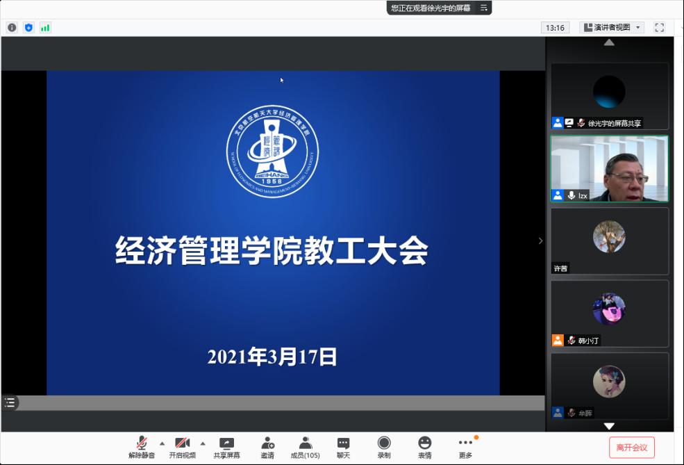 2021年3月17日下午,经管学院召开线上全院教工大会,传达学校2021年度工作要点,部署2021学院主要工作,开展师德师风、安全、保密教育和廉政党课。会议由分党委书记刘志新主持,120余位教职工参加了线上会议。会上,范英院长传达了学校2021年度学校工作会议精神,解读了2021年度学校工作要点。结合学校年度会议精神,范院长从本研教学工作、专硕教育工作、案例中心建设、本研学生工作、科研工作、推进学院品牌与信息化建设等方...