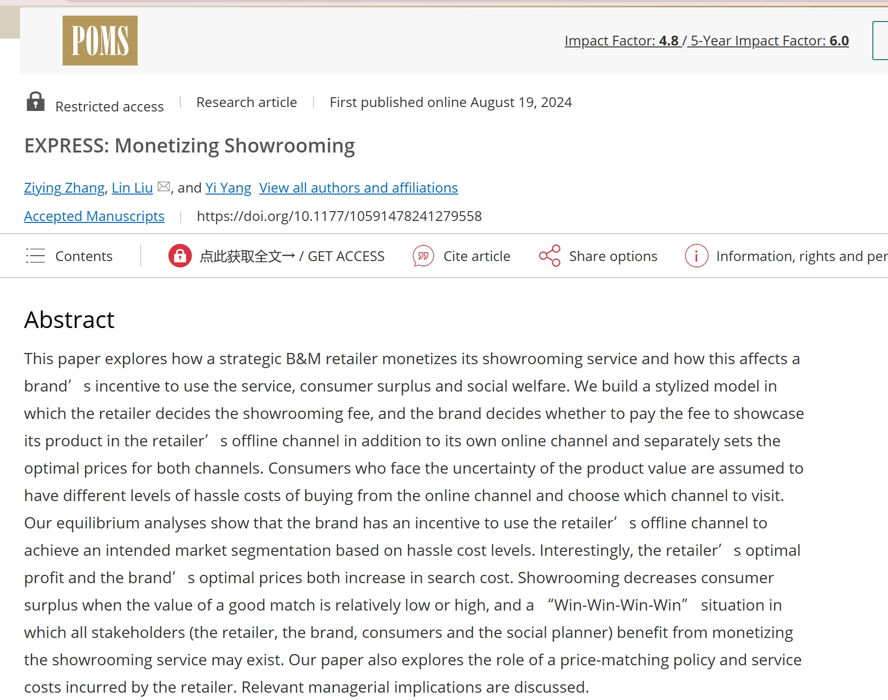 北航经管学院刘霖教授的论文《Monetizing Showrooming》,近日被UTD期刊Production and Operations Management录用。本研究成果曾获2023年ISCOM第四届全国供应链与运营管理学术年会最佳会议论文优胜奖。刘霖为本文的通讯作者,合作者为浙江大学杨翼教授,以及刘霖教授参与指导的张子颖博士。本论文是刘霖教授指导国内博士生发表的第二篇UTD论文,论文研究实体经济与数字经济融合的背景下,消费者线下体验商品后使用智能手机跳单...