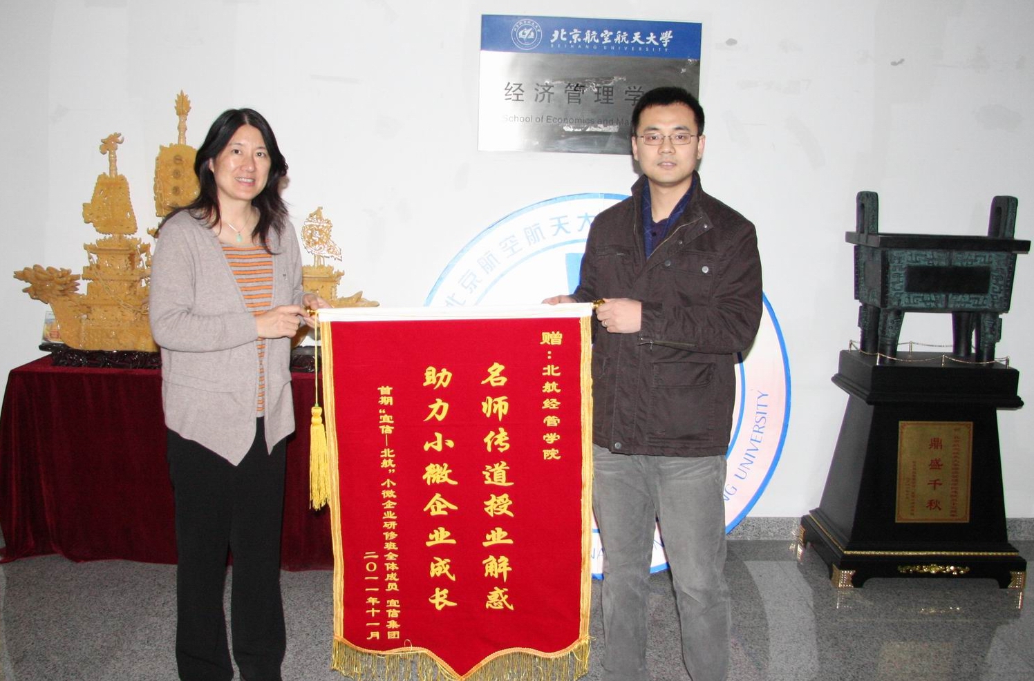 12月12日下午,宜信集团企业发展部高级经理姜川、孙丽娜代表该公司及小微企业学员来到我院MBA教育中心,将印有“名师传道授业解惑、助力小微企业成长”的锦旗送到北航beats365亚洲体育投注MBA教育中心主任苏文平副教授手中,...