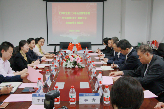 2014年5月9日15时在北航新主楼A座612,中远网络(北京)有限公司与北航经管学院就双方合作内容进行了深入沟通和交流,进而达成合作意向,共同签署了战略合作意向书、共建学生实习基地协议、北航研究生足球赛赞助协议...
